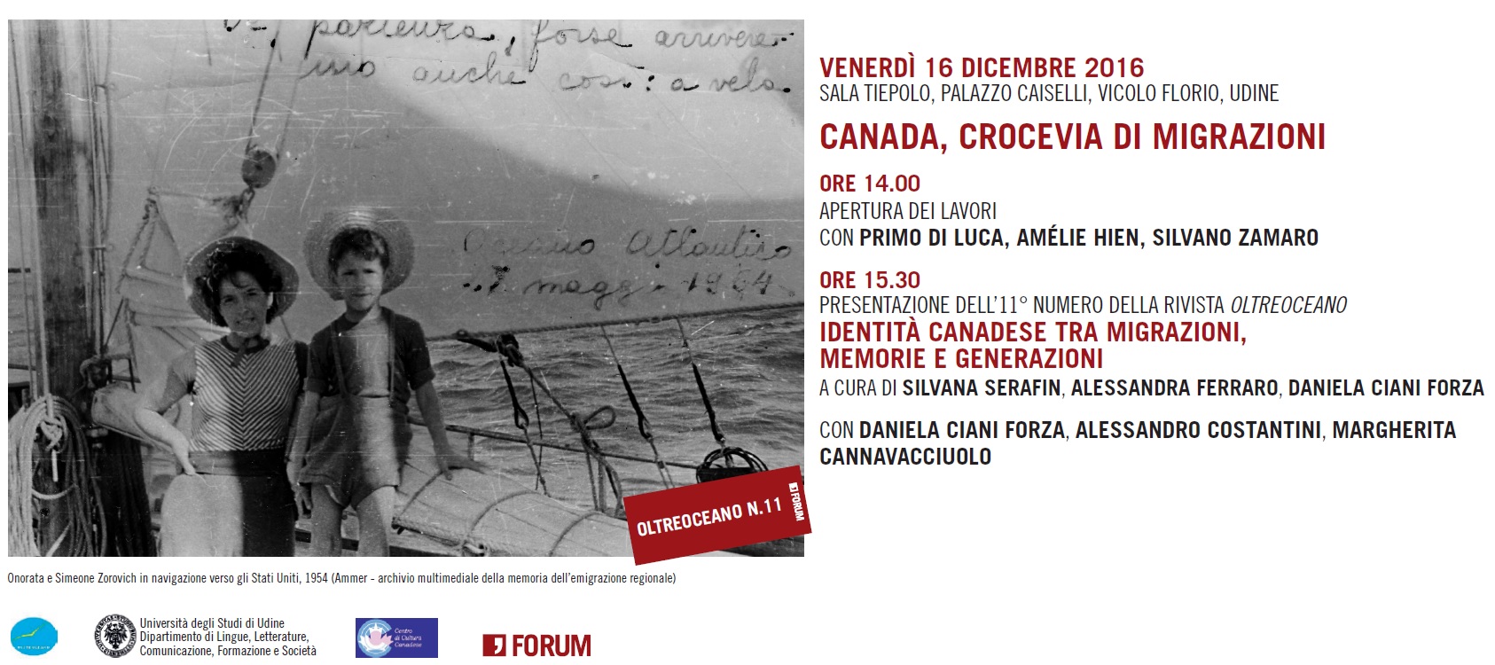Sarà presentato il n. 11 della rivista “Oltreoceano”, pubblicata da Forum Editrice, dedicato a “L’identità canadese tra migrazioni, memorie e generazioni”, a cura di Silvana Serafin, Alessandra Ferraro e Daniela Ciani Forza.
