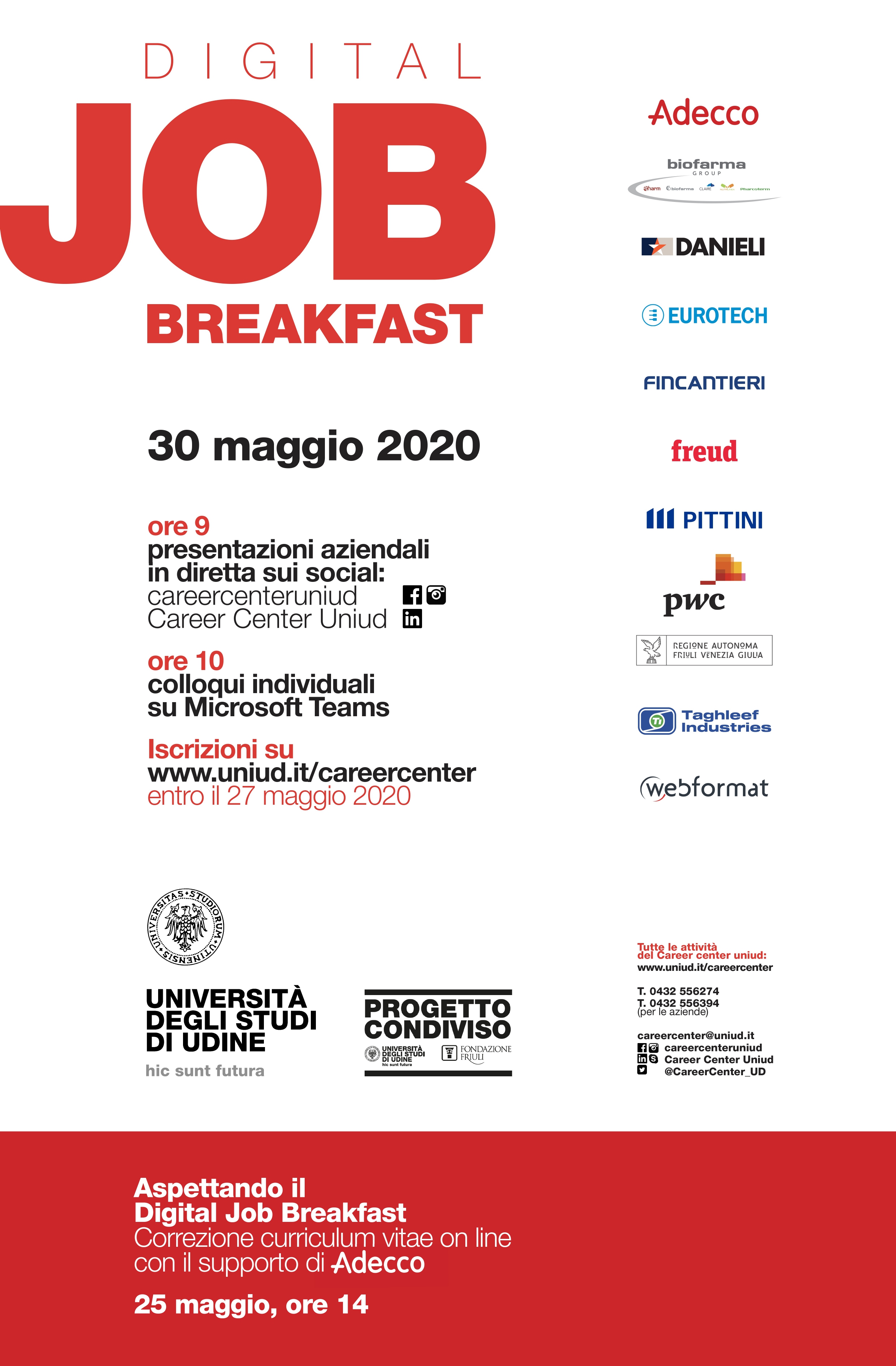 Sabato 30 maggio si svolgerà l'edizione digitale del Job Breakfast, il Career Day dell’Università degli Studi di Udine promosso per facilitare l’incontro tra aziende e laureati/studenti.