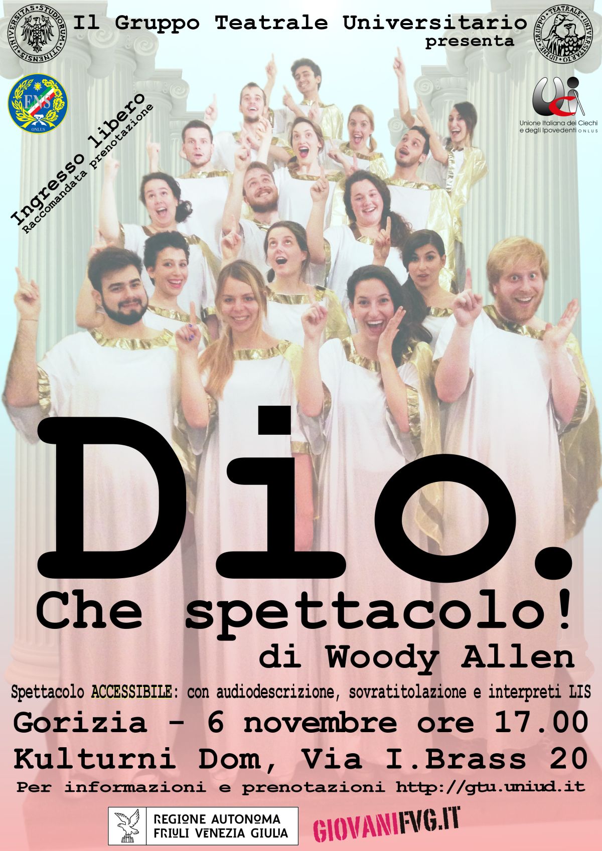 Commedia di Woody Allen. Con il suo humour geniale, l’autore americano riesce a conciliare satira farsesca con citazioni coltissime, giostrando sui temi filosofici di Dio e del libero arbitrio. Spettacolo accessibile alle persone sorde, cieche e ipovedenti.