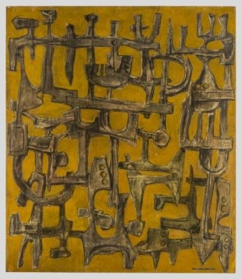 "Cancello", 1969, di Dino Basaldella. Bozzetto a tempera su tavola in scala 1:1 (2,20x190) del cancello in ferro saldato per lo stabilimento Morgante di Romans d'Isonzo