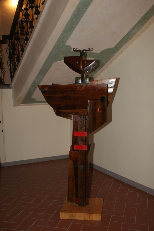 "Ettore", 2015, di Ennio Brandolini. Scultura antropomorfa (2,17 metri) in legno dipinto, metallo e vetro, che rielabora in chiave personale la figura dell’eroe omerico