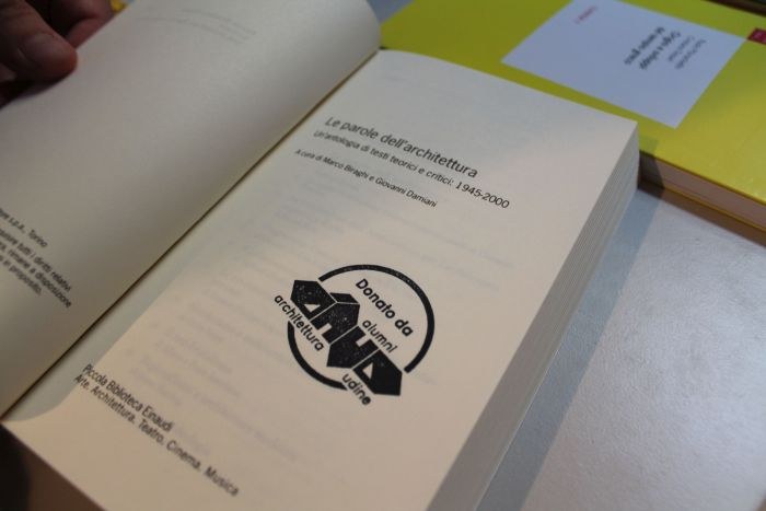 L’Associazione Alumni Architettura Udine – Aaud ha donato alla Biblioteca scientifica e tecnologica dell’Università di Udine 37 volumi, scelti attraverso un’analisi dei bisogni di studenti e docenti di architettura. Dopo un confronto fra la lista dei “desiderata” con la effettiva presenza dei volumi in biblioteca e con la lista dei futuri acquisti, l’Associazione ha provveduto alla fornitura dei volumi ancora mancanti. I libri sono stati resi riconoscibili attraverso il timbro con il logo dell’Associazione.