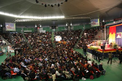 Un palasport Carnera gremito da oltre tremila studenti delle scuole regionali medie, superiori e dell’università di Udine ha accolto, alzandosi in piedi e applaudendo, Sua Santità Tenzin Gyatso, XIV Dalai Lama e premio Nobel per la Pace nel 1989. Un incontro emozionante, organizzato dal Centro di Accoglienza e promozione culturale E. Balducci di Zugliano e dal Centro per lo studio e la pratica della filosofia e della psicologia buddista Cian Ciub Ciö Ling di Polava.