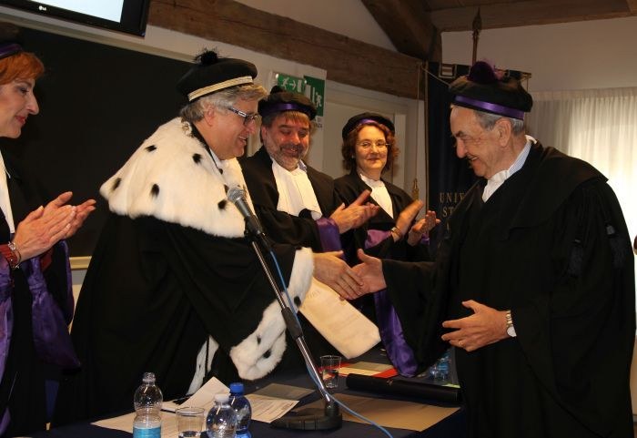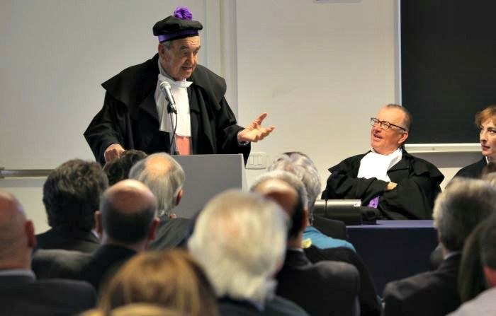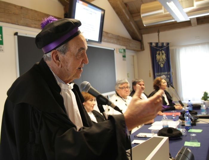 Dopo la laudatio il rettore De Toni, lette le motivazioni ufficiali, ha proclamato dottore honoris causa Bruno Pizzul che, indossata toga e tocco, ha preso la parola per tenere, a braccio, la sua lectio magistralis intitolata “Terra amata e raccontata”.