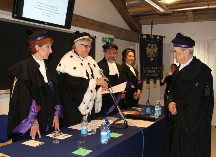 Da sinistra, Nicoletta Vasta, il rettore De Toni duratnte la proclamazione, Mauro Pascolini, Antonella Pocecco e Bruno Pizzul