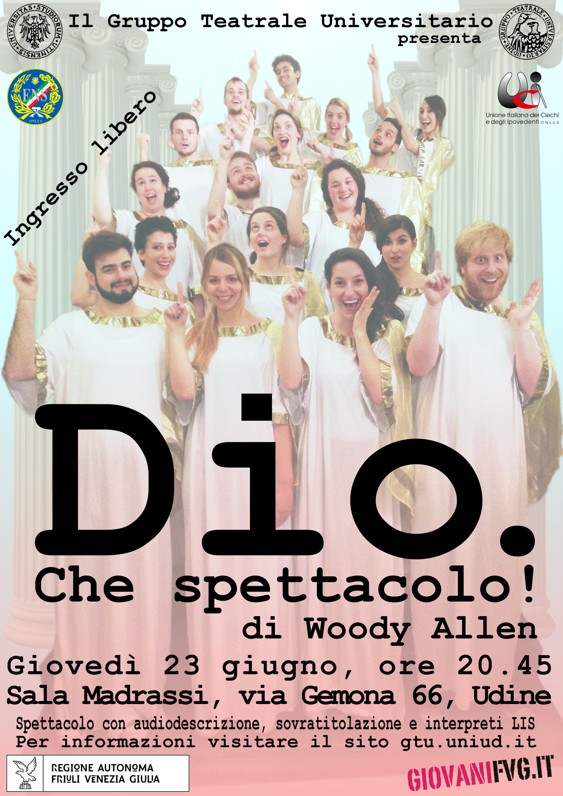 Giovedì 23 giugno alle 20.45 presso la Sala Madrassi in via Gemona 66 a Udine, il GTU Gruppo Teatrale Universitario di Udine porterà in scena "Dio. Che spettacolo!", una commedia di Woody Allen. Con il suo humour geniale, l’autore americano riesce a conciliare satira farsesca con citazioni coltissime, giostrando sui temi filosofici di Dio e del libero arbitrio.