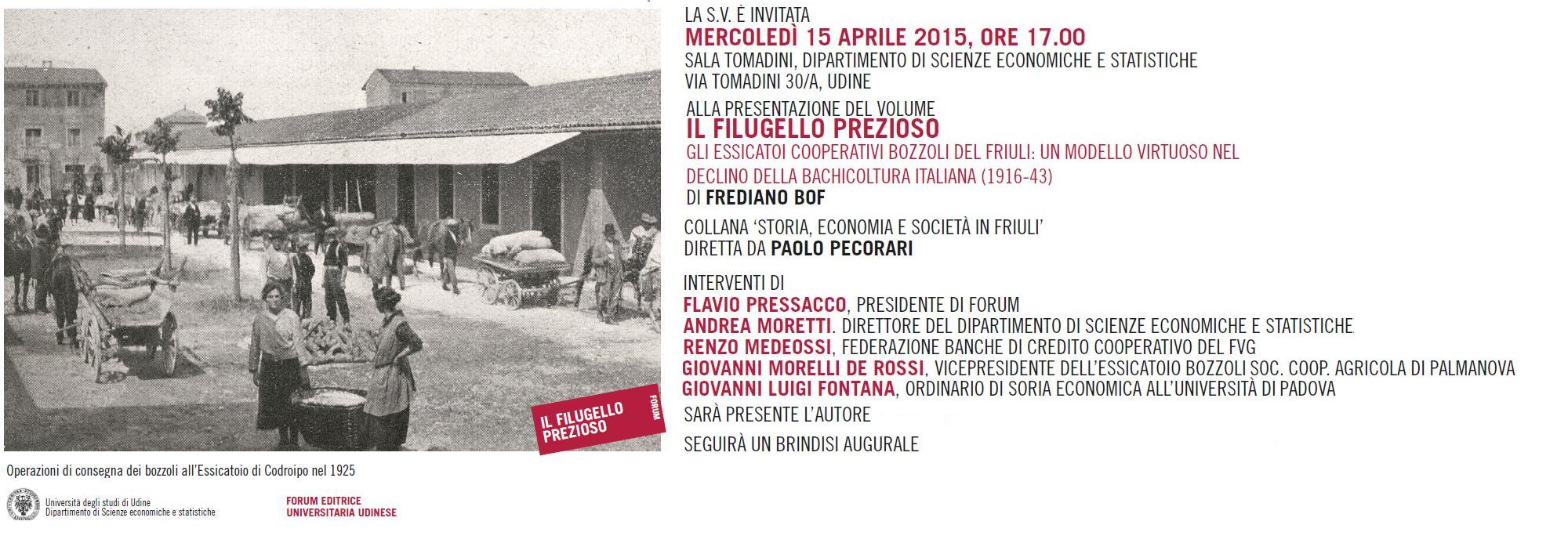 Il filugello prezioso sarà presentato mercoledì 15 aprile alle 17.00, presso la Sala Tomadini del Dipartimento di scienze economiche e statistiche in via Tomadini a Udine. Dopo i saluti del presidente della casa editrice Forum, Flavio Pressacco e del direttore del Dipartimento Andrea Moretti, interverranno Renzo Medeossi della Federazione delle banche di credito cooperativo del FVG, Giovanni Morelli De Rossi vicepresidente dell’Essiccatoio bozzoli di Palmanova e Giovanni Luigi Fontana ordinario di Storia economica all’Università di Padova.
