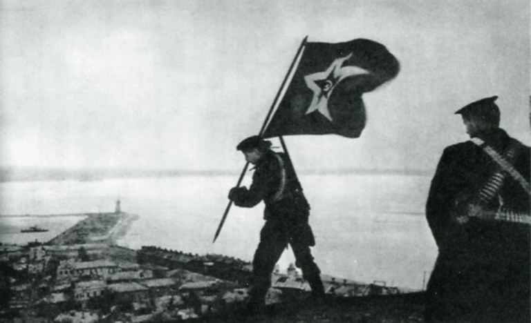 1944, i sovietici piantano la bandiera sul monte Mitridate dopo la riconquista sovietica di Kerč