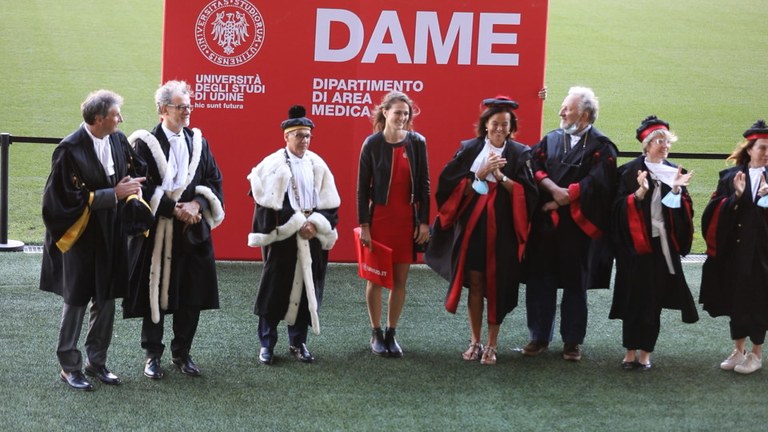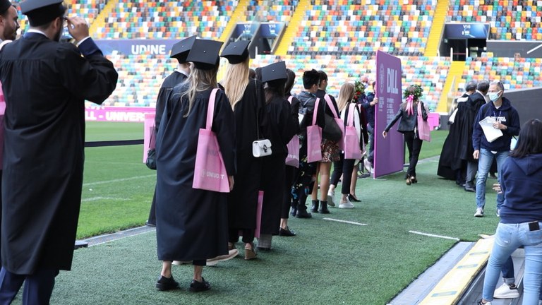 La cerimonia è stata riservata a tutti coloro che, durante l’emergenza Covid, hanno conseguito la laurea tra marzo 2020 e luglio 2021 in modalità online, nonché ai 61 migliori laureati che hanno partecipato al sistema premiale di Ateneo per l’anno accademico 2019/20, per i quali l’Università di Udine organizzava in passato il “Dies Academicus”.
