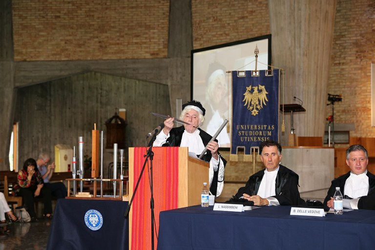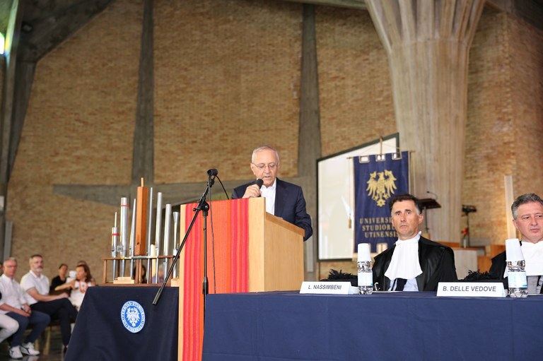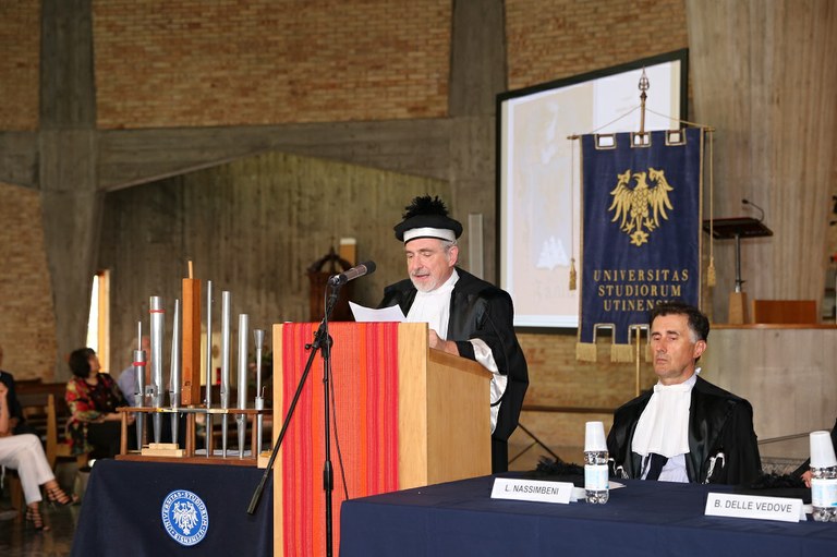 Dopo l’intervento del rettore, i saluti di Andrea Zannini, direttore del dipartimento di Studi umanistici e del Patrimonio culturale che ha sottolineato come la laurea conferita al maestro Zanin sia un evento storico essendo la prima proposta del dipartimento, «sorto da poco più di anno e che ha nella sua titolatura l’espressione “patrimonio culturale”».