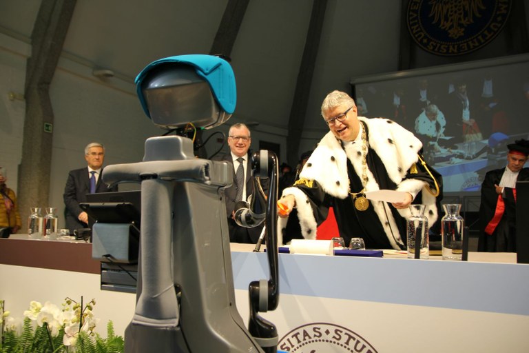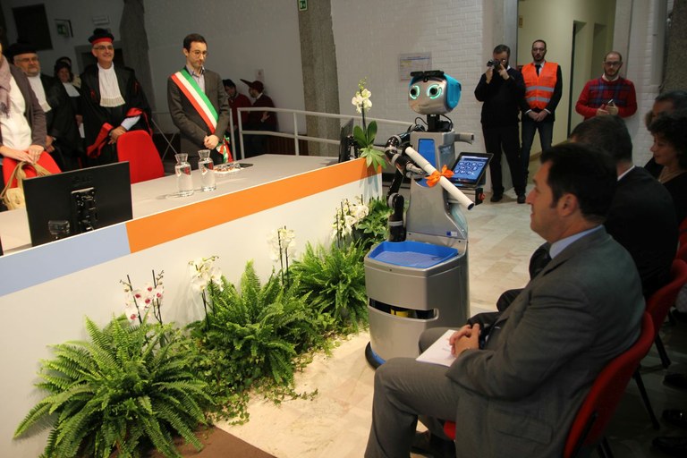 Si è inaugurato lunedì 21 novembre il 39° anno accademico dell'Università di Udine. La cerimonia ha preso avvio alle 10.30, nell'aula magna di piazzale Kolbe, con l'ingresso del corteo accademico. Per la prima volta in Italia, il robot sociale "Doro" ha partecipato alla cerimonia consegnando nella mani del rettore Alberto De Toni la sua relazione e scambiando con lui qualche parola di augurio per la cerimonia.