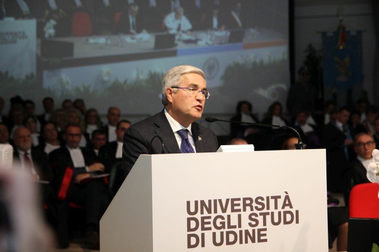 Nella sua relazione, il rettore De Toni ha illustrato numeri, stretegie, risultati raggiunti e iniziative future dell'ateneo, delineando il ruolo dell'Università di Udine nel contesto regionale, del Nordest e nazionale.