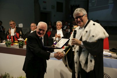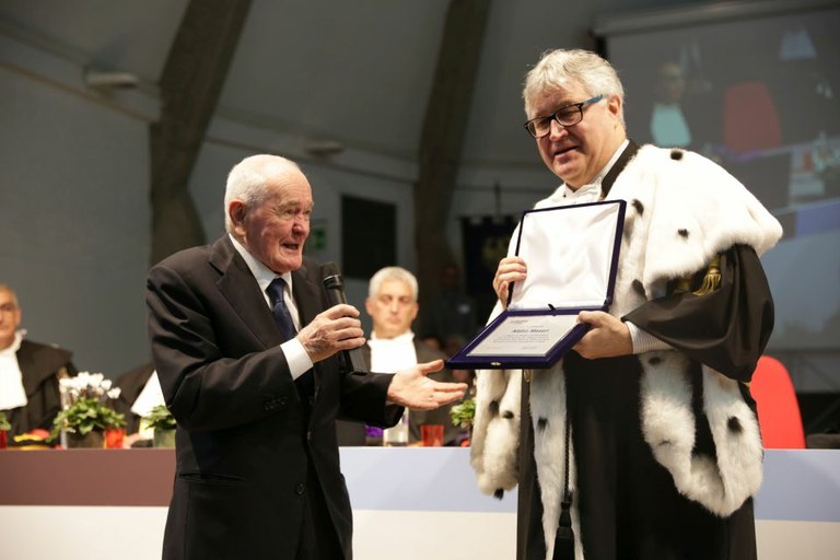 Il rettore De Toni ha quindi consegnato una targa di riconoscimento al professor Attilio Maseri, «autentico benemerito dell'Università di Udine» ha detto De Toni, ricordando le due donazioni fatte all'Ateneo dal cardiologo friulano di fama internazionale, ovvero la storica Biblioteca Florio, nel 2013, e, quest'anno, il palazzo Antonini del Palladio, fino al 2009 sede della Banca d'Italia. A ritirare il riconoscimento, il dottor Enrico Coccolo, collaboratore del professor Maseri.