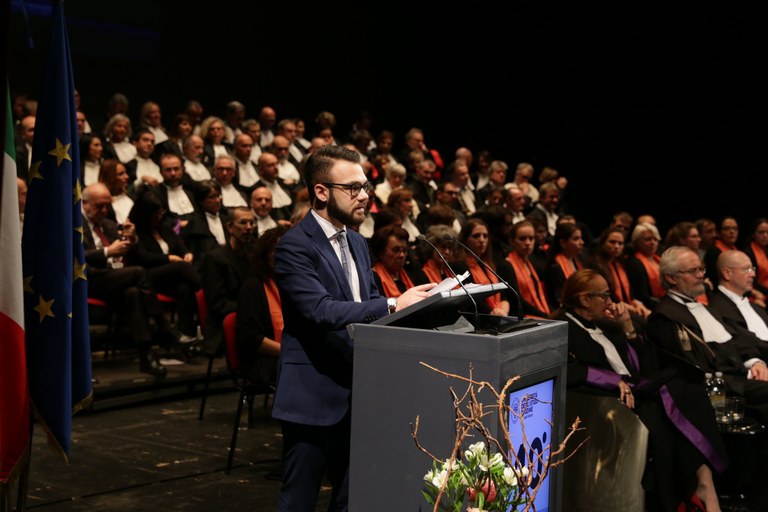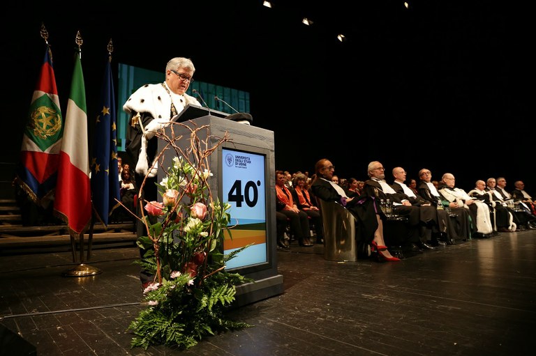 Dopo l’ingresso del corteo accademico, il rettore Alberto De Toni ha tenuto la sua relazione. Hanno poi preso la parola il presidente del Consiglio degli studenti, Simone Achenza, e il rappresentante del personale tecnico amministrativo nel Senato accademico, Maurizio Pisani. Quindi, l'intervento del professore emerito Franco Frilli, già rettore dell’Ateneo friulano dal 1983 al 1992, dedicata ai “40 anni dell’Università degli Studi di Udine”.