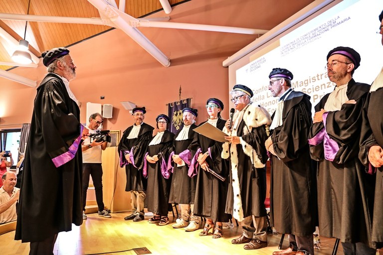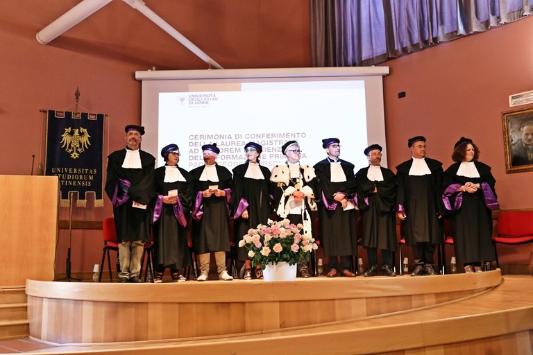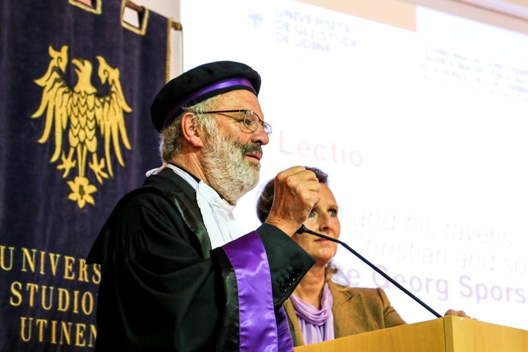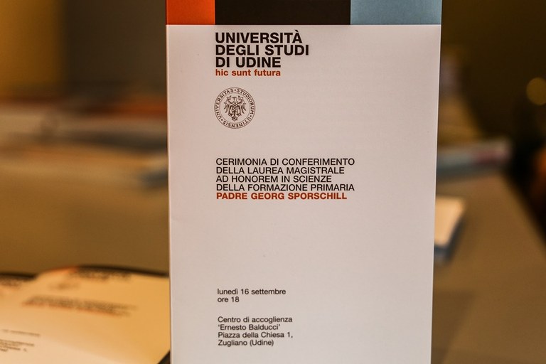 L’Università di Udine ha conferito la laurea magistrale honoris causa in Scienze della formazione primaria a Georg Sporschill, gesuita austriaco che ha dedicato la sua vita agli ultimi della società. La cerimonia si è svolta oggi nel Centro di accoglienza “Ernesto Balducci” di Zugliano (Ud). Hanno portato i saluti il rettore dell’ateneo friulano, Alberto De Toni (intervento pdf), la direttrice del Dipartimento di Lingue e letterature, comunicazione, formazione e società (DILL), Antonella Riem (intervento pdf), e il presidente del Centro di accoglienza e di promozione culturale “Balducci”, don Pierluigi Di Piazza. La laudatio (pdf) è stata affidata ad Anselmo Paolone, docente di pedagogia generale e sociale. Dopo il conferimento della laurea, padre Georg Sporschill ha tenuto la sua lectio dal titolo Elia e i suoi corvi. Messaggeri del lavoro sociale cristiano (pdf).