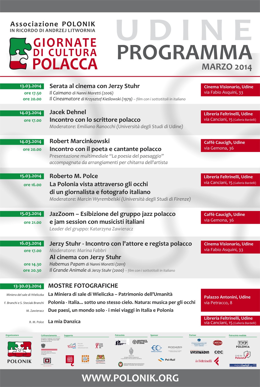 Le Giornate di cultura Polacca sono realizzate con il sostegno del Ministero degli Affari Esteri della Repubblica di Polonia, Consolato RP in Milano e l'Istituto Polacco dell'Arte Cinematografica di Varsavia che ha in particolare finaziato la rassegna dei film e l'incontro con J. Stuhr, nonche con il sostegno dell'Ente Nazionale Polacco per il Turismo di Roma, l'Istituto Polacco di Roma, Istituto del libro, Città di Cracovia e Città di Danzica. Tutto il progetto si svolge con il Patrocinio di Senato Polacco, Comune di Udine, Università degli Studi di Udine ed Associazione dei Polacchi in Italia.