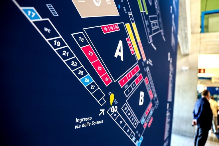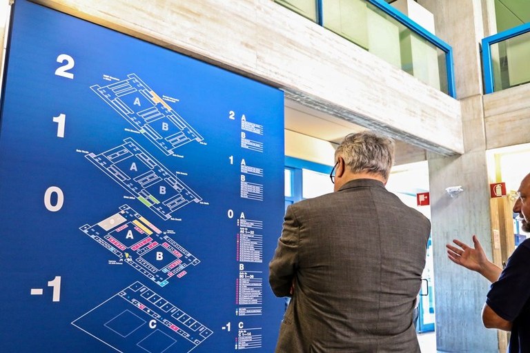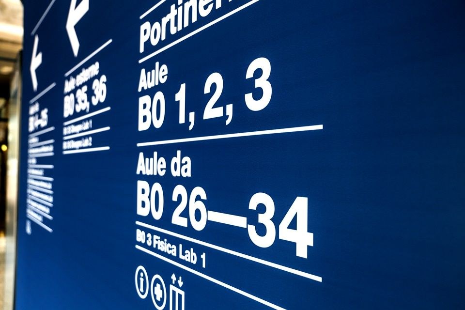 La nuova segnaletica di orientamento nasce dall’idea dell’organizzazione dei terminal aeroportuali: l’enorme edificio è stato infatti mappato e nominato per blocchi, contraddistinti da diverse lettere alfabetiche, che identificano le aree che raggruppano specifici spazi e aule.