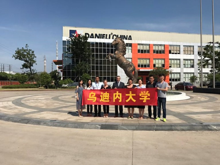 La delegazione alla Danieli China con lo striscione in cinese 'Università di Udine'