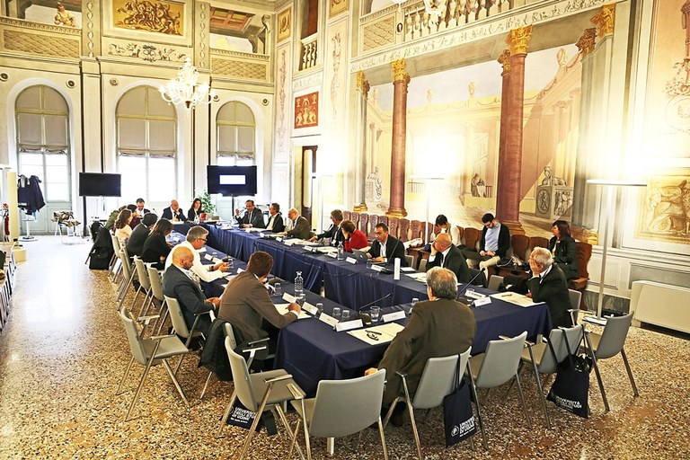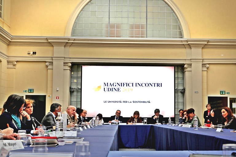 I lavori della prima giornata dei Magnifici Incontri, sul tema "Le Università Italiane per la sostenibilità", nell’ambito della manifestazione “Conoscenza in festa”, si sono aperti stamani nel Velario di palazzo Garzolini di Toppo Wassermann in via Gemona con gli indirizzi di saluto da parte di Alberto De Toni, rettore dell’Università di Udine e presidente della Fondazione CRUI, Pietro Fontanini, sindaco di Udine, Giuseppe Morandini, presidente della Fondazione Friuli, Alessia Rosolen, assessore regionale al Lavoro, formazione, istruzione, ricerca, università e famiglia del Friuli Venezia Giulia.