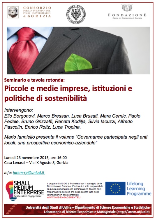 “Piccole e medie imprese, istituzioni e politiche di sostenibilità” è il tema del seminario che l’Università di Udine organizza a Gorizia lunedì 23 novembre, dalle 16, a Casa Lenassi, in via IX agosto 8. Sarà un momento di discussione e confronto tra amministratori locali, imprenditori e studiosi sui diversi approcci delle piccole e medie imprese di fronte a scenari complessi quali la sostenibilità ambientale. L’incontro si concentrerà, in particolare, sull’importanza rivestita dagli intermediari e dagli strumenti di inclusione a disposizione di cittadini, amministratori e imprese. L’appuntamento è organizzato dal Laboratorio di ricerca economica e manageriale (Larem) del dipartimento di Scienze economiche e statistiche dell’ateneo, con il patrocinio di Comune e Provincia di Gorizia.