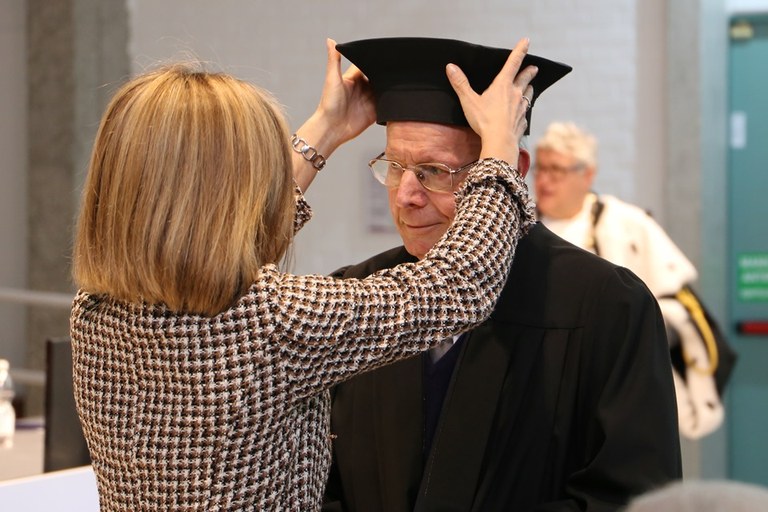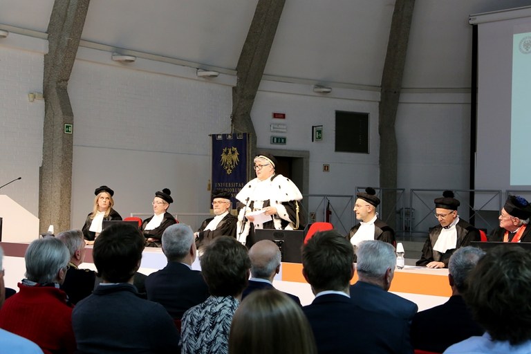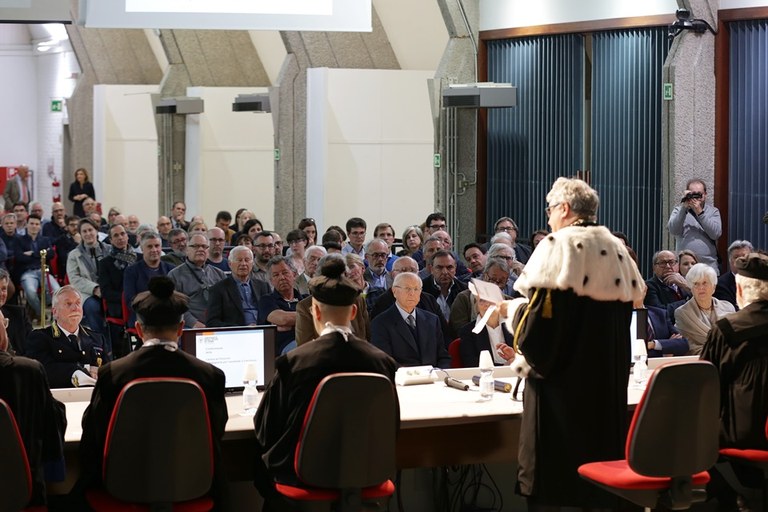 Prima della consegna del diploma di laurea, gli indirizzi di saluto del rettore Alberto De Toni e del prof. Marco Petti, direttore del DPIA. Ma il rettore ha innanzitutto dato la parola al professor Giorgio Macchi, docente emerito all'Università di Pavia, che è stato chiamato a fare parte della Commissione di esperti interni ed esterni costituita dall'ateneo per la valutazione della proposta di conferimento della laurea, insieme con il prof. Sebastiano Pelizza, (Politecnico di Torino) e Luigi Biolzi (Politecnico di Milano). «La costruzione è sempre stata la sua creatura e il suo pensiero sempre impegnato a perfezionare la regola di sempre e di tutti, trasformando sempre il suo lavoro in un'Arte», ha detto il professor Macchi in apertura.
