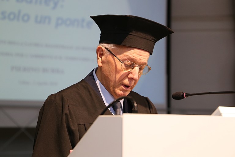 «La leggenda vuole che alcune brillanti idee nella storia della scienza e della tecnologia – ha esordito Burba - siano nate da un’intuizione scarabocchiata velocemente sul retro di una busta. Il ponte Bailey è una di queste e la campagna d'Italia fu lo scenario di guerra nel quale si costruirono il maggior numero di ponti Bailey. E questo ponte nato nel corso della guerra è diventato oggi un ponte di pace». Dopo questa digressione storica, il neodottore ha raccontato come il manufatto sia entrato nella sua storia: dal Ponte sul Tagliamento, nel 1962, fino a quelli di Pietratagliata in Alto Friuli per l'alluvione del 2003 e in Sud Sudan nell’ambito di una recente missione umanitaria organizzata dal Dipartimento della Protezione Civile per togliere dall’isolamento il villaggio di Yrol durante la stagione delle piogge.