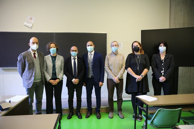 Tawab Ahmad Mushtaq , al centro con il rettore Roberto Pinton, e la Commissione di laurea