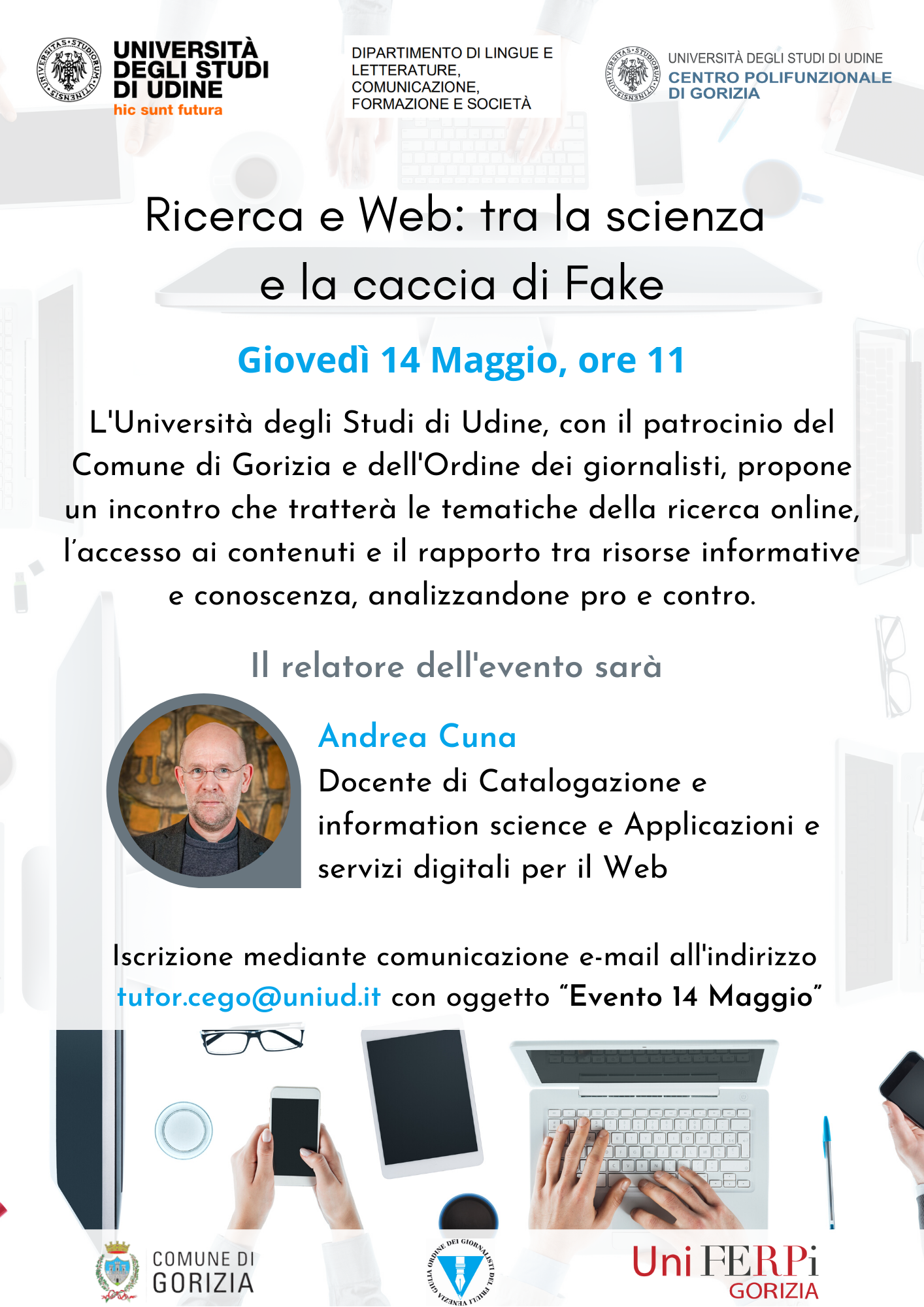 L’intervento si svolge nella serie di incontri organizzati dall’Università di Udine, patrocinati e in collaborazione con il Comune di Gorizia, l’Ordine dei Giornalisti e Uni-Ferpi Gorizia (la sezione universitaria-giovani della Federazione Relazione Pubblica Italiana). Gli eventi si svolgono nell’ambito dell’insegnamento di Comunicazione mobile e nuovi media del docente Nicola Strizzolo, con il supporto del Progetto Identità Digitale RP, WE are Uniud, delle tutor Cego e delle studentesse Maria Mattaloni e Federica Vassallo.