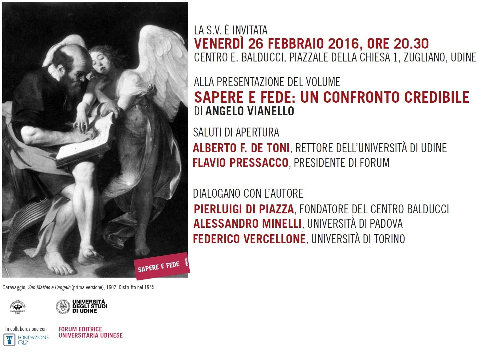 Non esiste luogo migliore per favorire la mediazione tra fede e scienza che il Centro Balducci di Zugliano (piazzale della Chiesa, 1 – Zugliano, Ud) -, luogo di accoglienza e cultura, dove venerdì 26 febbraio alle 20.30 sarà presentato il volume. A dialogare con l’autore, dopo i saluti di Alberto F. De Toni e Flavio Pressacco, saranno Pierluigi Di Piazza, Alessandro Minelli e Federico Vercellone.
