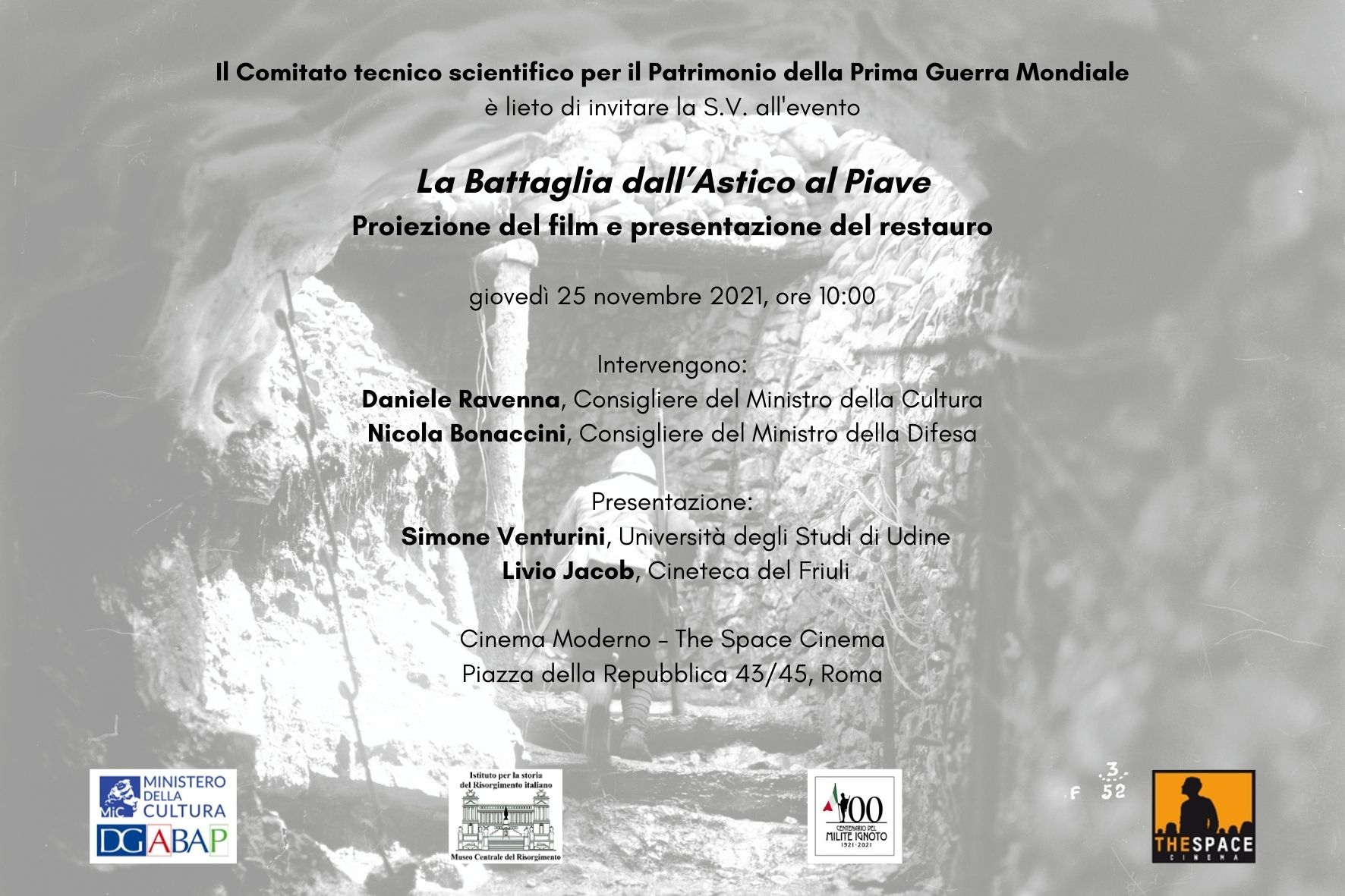 Giovedì 25 novembre, alle 10, al “Cinema Moderno – The space cinema” di Roma si terrà la proiezione e la presentazione del restauro, effettuato dall’Università di Udine, del film dal vero “La battaglia dall'Astico al Piave” (1918). L’evento è organizzato dal Comitato tecnico-scientifico per il Patrimonio della Prima guerra mondiale e dall'Istituto per la storia del Risorgimento Italiano nell’ambito delle iniziative per il Centenario del Milite Ignoto.