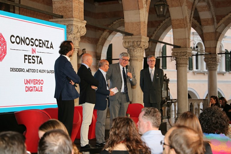 È stato un simpatico e simbolico “taglio del nastro” virtuale a segnare, martedì 26 sera, l’inaugurazione ufficiale del festival Conoscenza in festa nel centro di Udine sotto la Loggia del Lionello, ribattezzata “Loggia dell’Innovazione”. Al saluto iniziale alla città della manifestazione che fino al 30 giugno ruoterà attorno al filo rosso tematico “Universo digitale”, c’erano il rettore dell’ateneo friulano Alberto De Toni, il prorettore vicario Roberto Pinton, il delegato del rettore per il settore Reti e Sistemi telematici, Pier Luca Montessoro, il presidente dell’associazione Mitteleuropa e membro del cda dell’università, Paolo Petiziol, e il direttore artistico del festival Jader Giraldi.