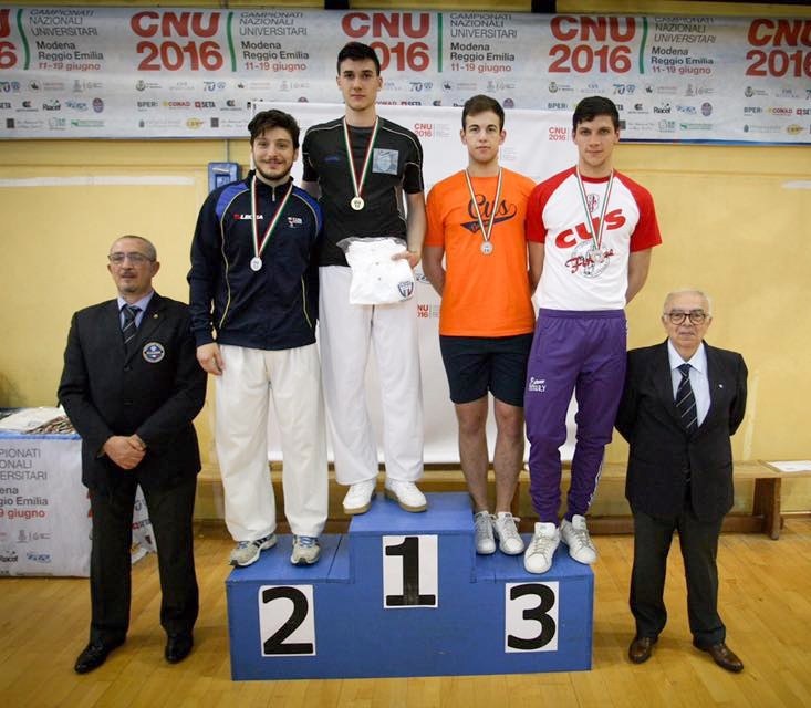 Partenza “col botto” nei dieci giorni di gare: sabato 11 giugno è già medaglia d’oro grazie a Nico Armanelli, che bissa il primo posto dell’anno scorso a Salsomaggiore e conquista la sua terza medaglia ai CNU (conquistò un argento nel 2014 a Milano) nel Karate specialità Kumite, categoria -94kg. L’atleta guidato dal maestro Sodero sbaraglia la concorrenza, sconfiggendo, nell’ordine, Giuseppe De Lucia (CUS Foro Italico), Simone Marino (CUS Firenze) e Natale Scarpitta (CUS Salerno).