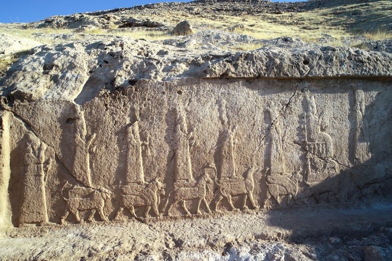 The panels found are impressive, almost 5 meters long and 2 meters high. An extraordinary collection of gods and sacred animals is depicted on the rock surface. The divine figures represent the god Ashur, the main deity of the Assyrian pantheon, on a dragon and a lion with horns; his wife Mullissu, seated on an elaborate throne supported by a lion; the god of the moon, Sin, also on a horned lion; the god of wisdom, Nabu, on a dragon; the sun god, Shamash, on a horse; the storm god, Adad, on a lion with horns and a bull; and Ishtar, the goddess of love and war, on a lion. The reliefs, repeated in ten examples (and others are probably still buried under the debris that fills the canal), were made by the Assyrian ruler to celebrate the construction of the irrigation canal. The carved bas-relief panels represent a scene of profound religious and ideological significance centred on the king's worship of the deities by the king – and celebrate the creation of this important hydraulic infrastructure designed to ensure fertility and enhanced agricultural productivity in the surrounding area.