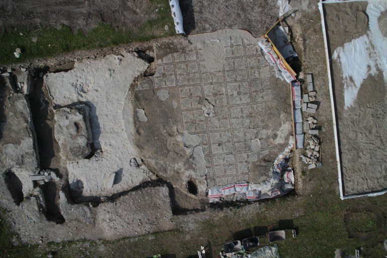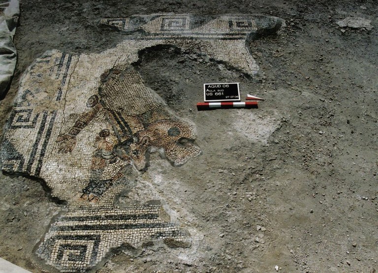 Sopra la fontana fu steso un mosaico a grandi tessere cubiche di pietra e di cotto, con quadrati ornati da fioroni stilizzati, che pavimentava un ambiente rettangolare sicuramente appartenente alle Grandi Terme costantiniane e forse affacciato su un grande cortile porticato a nord della piscina (natatio). Sempre in questa zona, un angolo del pavimento a grandi tessere ha rivelato un antico cedimento strutturale, dovuto al terreno instabile o a fenomeni sismici, che provocò il crollo delle coperture e la completa ristrutturazione della zona. «La conferma – spiega Marina Rubinich - che Aquileia, nel pieno V secolo, era ancora in grado di promuovere importanti costruzioni: da un unico salone lungo 15 metri furono ricavati una sala ottagonale circondata da uno spesso muro anulare e un ambiente rettangolare più piccolo, entrambi pavimentati da mosaici policromi, geometrici e figurati».