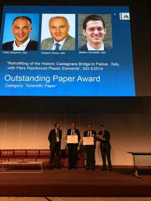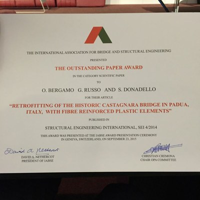 Il lavoro è stato pubblicato nell’articolo “Retrofitting of the historic Castagnara bridge in Padua, Italy, with fibre reinforced plastic elements" che ha ottenuto il premio come migliore articolo scientifico pubblicato nel 2014 sulla rivista Structural Engineering International (SEI) del International Association for Bridge and Structural Engineering (IABSE). La premiazione è avvenuta a Ginevra lo scorso 23 settembre nell’ambito della IABSE Conference 2015.