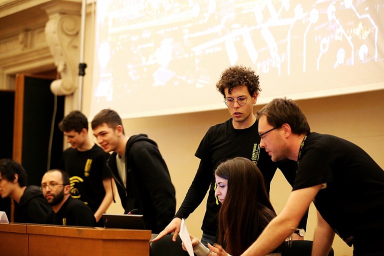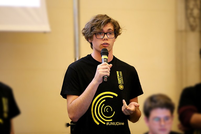 Quanti hanno scelto di mettere alla prova le loro competenze e la loro creatività partecipando alla giornata si sono ritrovati prima nell’aula studio Mantica dell'Università degli Studi di Udine la fase di progettazione, e poi alla cerimonia di premiazione in sala Aiace, dove si è riunita la giuria e dove l’evento si è aperto alla cittadinanza. Qui il saluto introduttivo del prof. Carlo Tasso, ordinario di Sistemi di elaborazione delle informazioni al Dipartimento di scienze matematiche, informatiche e fisiche, coordinatore dell’Officina Sistemi Digitali