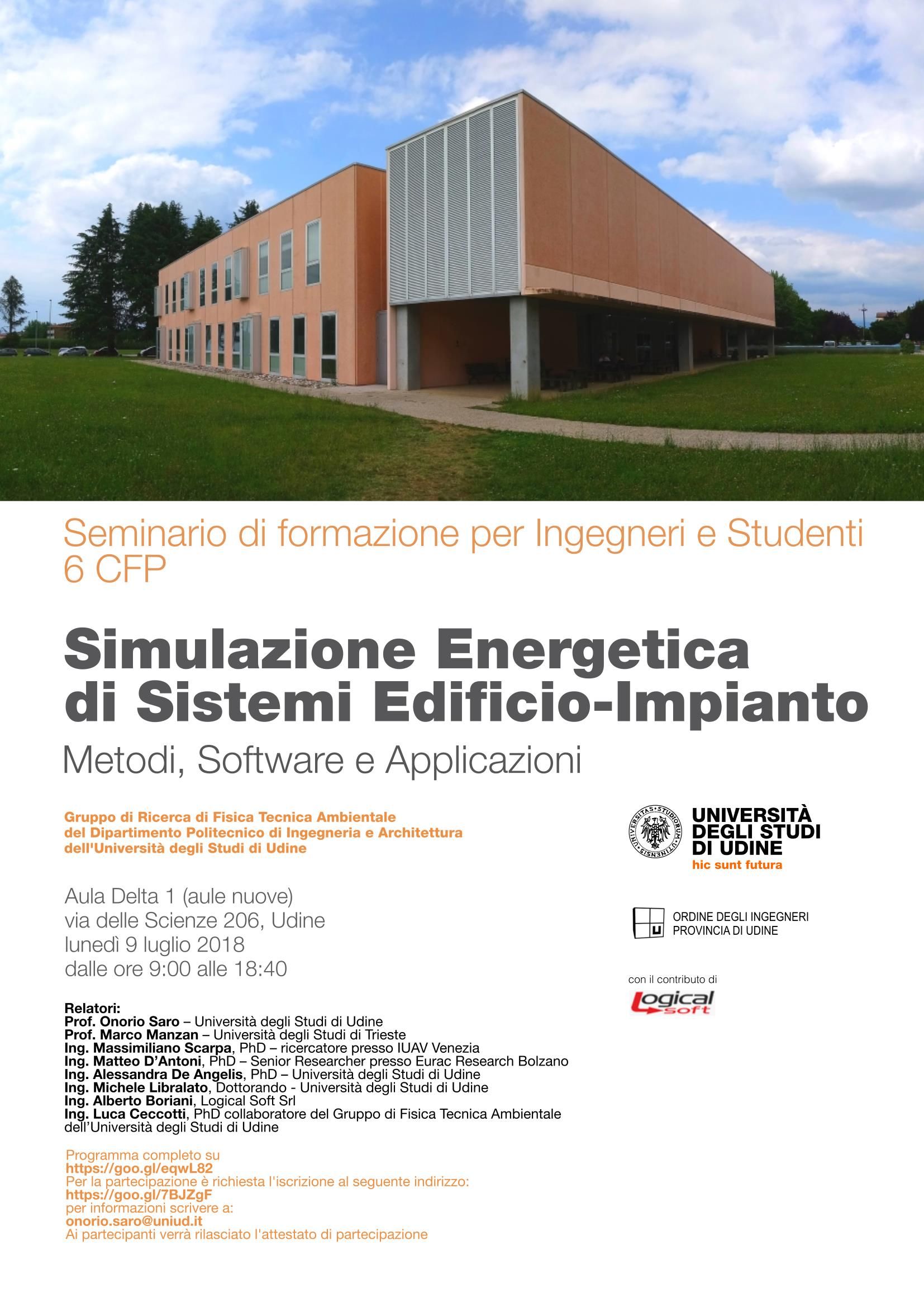 Il Gruppo di ricerca di fisica tecnica ambientale del Dipartimento Politecnico di ingegneria e architettura, in collaborazione con l'Ordine degli Ingegneri della Provincia di Udine e con il contributo di Logical Soft Srl, propone il convegno dal titolo "Simulazione energetica dei sistemi edificio-impianto", ad iscrizione gratuita, aperto a professionisti e a studenti per trattare il tema della simulazione energetica, con particolare attenzione alle nuove normative e ai metodi di calcolo più avanzati.