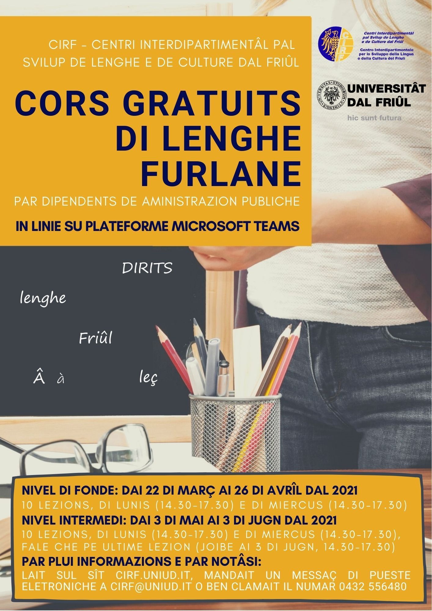 Ancje pal 2021 il Centri interdipartimentâl pal svilup de lenghe e de culture dal Friûl (CIRF) de Universitât dal Friûl al torne a proponi i siei cors gratuits di lenghe furlane indreçâts ai dipendents de aministrazion publiche e inmaneâts in gracie dai fonts de leç 482 dai 15 di Dicembar dal 1999, pe tutele des “minorancis linguistichis storichis”. Pe session de Vierte a son in program doi cors, un di nivel di fonde, dai 22 di Març ai 26 di Avrîl, e un di nivel intermedi, dai 3 di Mai ai 3 di Jugn.