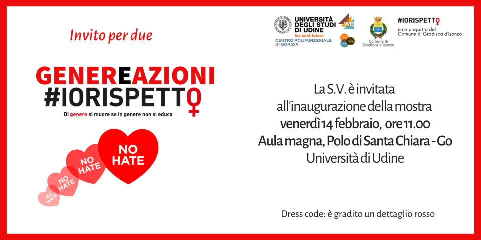 Si inaugura venerdì 14 febbraio alle 11 nell’Aula magna del polo universitario di Santa Chiara a Gorizia (via S. Chiara 1) la mostra dal titolo “Genereazioni #iorispetto”. L’iniziativa nasce dall’idea degli studenti e delle studentesse del Laboratorio di tecniche di organizzazione dei corsi di laurea in Relazioni Pubbliche e in Comunicazione integrata per le imprese e le organizzazioni dell’Università di Udine che hanno partecipato lo scorso novembre al progetto del Comune di Gradisca d’Isonzo “#iorispetto”.